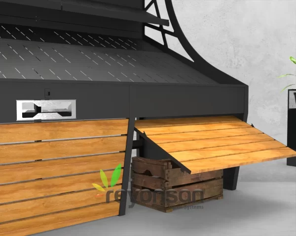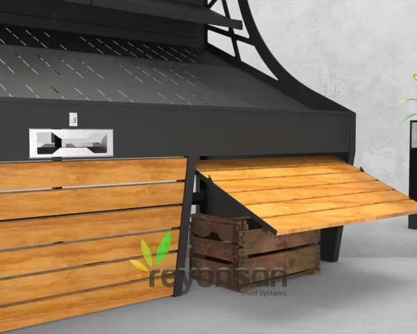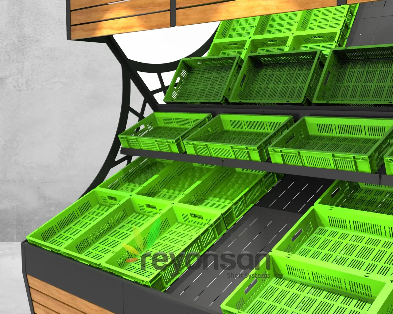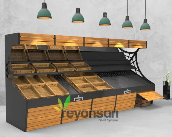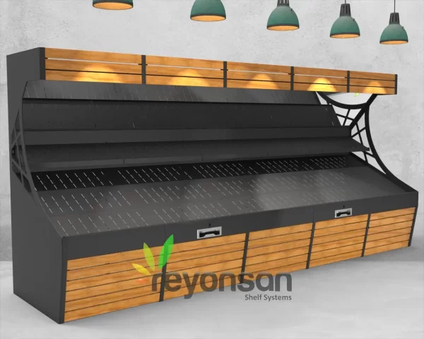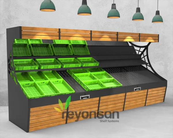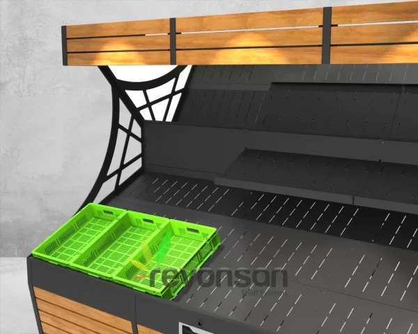 Reyonsan firması, AR302 Manav Reyonu’nu tasarladı ve üretti. Bu reyon, ahsap ve metal görünümüyle modern bir tasarıma sahiptir. Hem şık hem de fonksiyonel olan AR302 Manav Reyonu, müşterilerin mağaza alanlarında ürünlerini sergilemelerini kolaylaştırır.